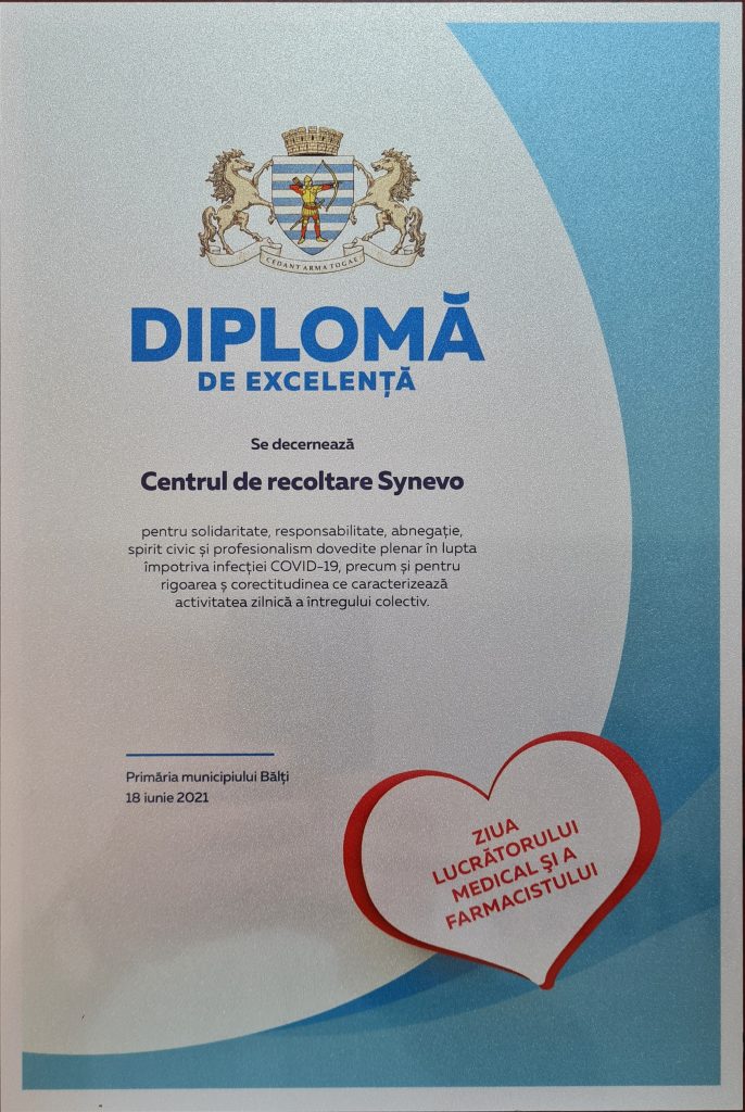 Multumita acestui fapt, Laboratorul Synevo din mun. Balti a fost onorat cu Diploma pentru recunostinta, solidaritate, responsabilitate, abnegatie, spirit civic si profesionalism dovedite in combaterea infectiei cu noul Coronavirus, oferita de Primaria municipiului Balti!