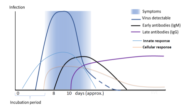 Seroconversia IgM sau IgG se poate produce simultan sau secvențial, iar titrurile anticorpilor ating un nivel de platou în decurs de 6 zile de la momentul seroconversiei.